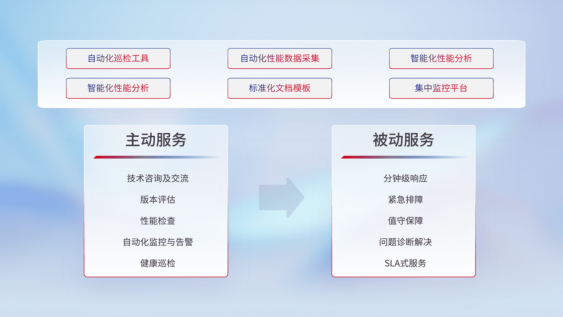 智能化工具和标准化文档,,,保障服务质量,,,提供主动服务(包含技术咨询、、版本评估、、性能检查、、、自动化监控与告警、、、健康巡检)和被动服务包含(分钟级响应、、、紧急排障、、、、值守保障、、问题诊断解决、、SLA服务)。。。